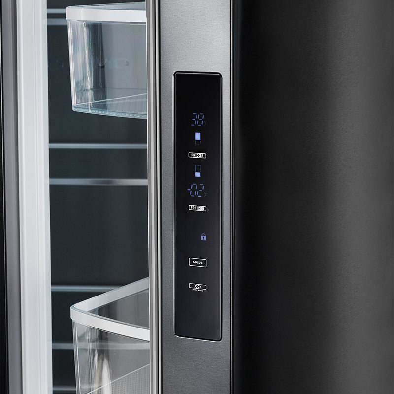 - Easy-to-use digital touch controls allow for precise temperature adjustments in both the refrigerator and freezer